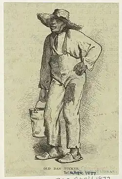 "Old Dan Tucker," also known as "Ole Dan Tucker," "Dan Tucker," and other variants, is an American popular song. Its origins remain obscure; the tune may have come from oral tradition, and the words may have been written by songwriter and performer Dan Emmett. The blackface troupe the Virginia Minstrels popularized "Old Dan Tucker" in 1843, and it quickly became a minstrel hit, behind only "Miss Lucy Long" and "Mary Blane" in popularity during the antebellum period. "Old Dan Tucker" entered the folk vernacular around the same time. Today it is a bluegrass and country music standard. It is no. 390 in the Roud Folk Song Index.