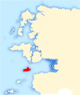 Clare Island (Irish: Cliara or Oileán Chliara), also historically Inishcleer,[1] is a mountainous island guarding the entrance to Clew Bay in County Mayo, Ireland. Historically part of the kingdom of Umhaill, it is famous as the home of the 16th century pirate queen Gráinne O'Malley. The population of the island is 138 according to the 2022 census.[3] To the south-west lies Inishturk (inhabited) and Caher Island (uninhabited), and to the north is Achill Island.