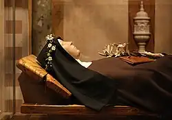 On 9 August 1253, two days before her death, the papal bull Solet annuere of Pope Innocent IV confirmed that Clare's rule would serve as the governing rule for Clare's Order of Poor Ladies. Her remains were interred at the chapel of San Giorgio while a church to hold her remains was being constructed. At her funeral, Pope Innocent IV insisted the friars perform the Office for the Virgin Saints as opposed to the Office for the Dead.[18] This move by Pope Innocent ensured that the canonization process for Clare would begin shortly after her funeral. Pope Innocent was cautioned by multiple advisers against having the Office for the Virgin Saints performed at Clare's funeral.[18] The most vocal of these advisers was Cardinal Raynaldus, who would later become Pope Alexander IV and, in two years' time, would canonize Clare.[19] At Pope Innocent's request the canonization process for Clare began immediately. While the whole process took two years, the examination of Clare's miracles took just six days. On 26 September 1255,[20][21] Pope Alexander IV canonized Clare as Saint Clare of Assisi. Construction of the Basilica of Saint Clare was completed in 1260, and on 3 October of that year Clare's remains were transferred to the newly completed basilica where they were buried beneath the high altar. In further recognition of the saint, Pope Urban IV officially changed the name of the Order of Poor Ladies to the Order of Saint Clare in 1263.