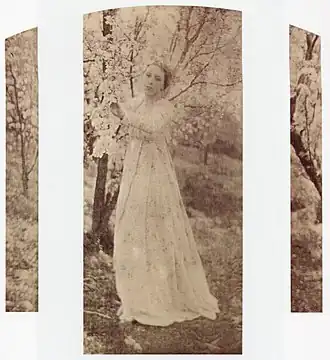 White did not record how soon he took up photography after he and his wife returned to Newark, but it had to have been quickly. There are at least two photographs taken by him that date from that same year, 1893, and by the following year he was deeply engaged in his new interest.[5] White's grandson wrote, "It is not coincidental that Clarence White's life in photography began in the year of his marriage. My grandmother wore a great many hats, and all with real flair; she was wife, mother, business manager, model, aesthetic critic, stoic, and a buffer between my grandfather and many of the unpleasantnesses of life. With steadfast devotion, she created an environment in which he could lead a calm and productive life."[6] The considerable influence of his wife in White's artistic development may be seen later when he began corresponding with Alfred Stieglitz; White often used the words "we" or "Mrs. White and I" when describing his most recent photographic activities.[6]