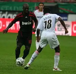 A world class midfielder, in addition to his fitness and athletic characteristics, as well as his ability to break down opposing plays and win back possession,[51][52] he was an elegant, creative player and an excellent dribbler, possessing outstanding technique, ball skills and vision, which enabled him to retain possession when under pressure and subsequently lay the ball off to an on-rushing teammate;[57] he was also an accurate passer and crosser of the ball.[51][53][58][59] Seedorf was also capable of scoring goals due to his powerful, accurate striking ability from distance with either foot;[51][52][60][61] furthermore, he was an effective free kick taker.[62] Despite his physical, energetic, and tenacious style of play, Seedorf was regarded as a player with good behavior, and was sent off only two times in his entire career. In addition to his success and footballing skills, Seedorf has also been praised for his longevity as a footballer.[51]