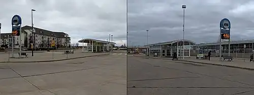 The Clareview Transit Centre is located on the east (known as "East Clareview") and west (known as "West Clareview") sides of the LRT station. The sides are connected to the station by a pedestrian underpass, that also connects to the LRT station. This transit centre features many amenities including park and ride, bike racks, passenger drop off area, large shelter and pay phone.[7] The LRT station adjacent includes a snack shop and washrooms.[8]