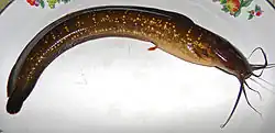 Clarias is a genus of catfishes (order Siluriformes) of the family Clariidae, the airbreathing catfishes. The name is derived from the Greek chlaros, which means lively, and is about the ability of the fish to live for a long time out of water.[1]