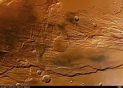 Long narrow depressions on Mars are called fossae. This term is derived from Latin; therefore fossa is singular and fossae is plural.[3] Troughs form when the crust is stretched until it breaks. The stretching can be due to the large weight of a nearby volcano. Fossae/pit craters are common near volcanoes in the Tharsis and Elysium regions.[4] A trough often has two breaks with a middle section moving down, leaving steep cliffs along the sides; such a trough is called a graben.[5]
