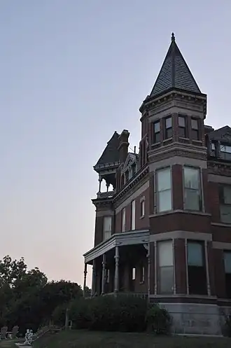The Victorian eclectic style house is located on a bluff overlooking the Mississippi River. Its exterior ornamentation incorporates multiple stylistic elements, and is composed of Baltimore pressed brick that was laid in a running bond. It features red granite columns with limestone capitals that flank the main entrance, limestone window sills and lintels, a tin and limestone cornice, and a slate hip roof. Towers project from the east and west corners. The west corner tower is capped with a pyramidal roof and the east corner tower is capped with a hexagonal turret roof.[3]