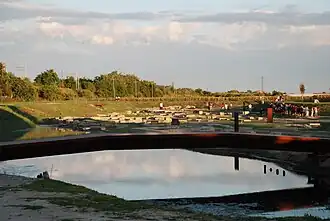 Augustus may have chosen this site because of its strategic position. The area in which Augustus wanted to construct Classe was in a lagoon.[6] It was impregnable from land and surrounded by marshes. The base was artificially constructed in this lagoon.[7] Unlike the ports of Portus or Ostia, Classe did not feature a hexagonal basin. Instead the base installations were built on stilts.[8] Once those were in place the port was made of large oak beams. By the 1st century CE the builders had incorporated ceramic fragments. By the 2nd century, it was redone with bricks.[9] Augustus designed the port for military purposes only.[10] The town had only one weakness, access to fresh water. This obstacle was overcome by the Emperor Trajan who built a 35 km (22 mi) long aqueduct to Ravenna, that might also have supplied Classe.[11] After the fleet was built, the population of the soldiers and their families living there grew slowly but steadily.[12] For the next three hundred years, Classe would be one of Rome's most important naval bases, the home of the eastern Mediterranean fleet.[13] According to Jordanes, Cassius Dio put the size of the fleet at two hundred and fifty ships.[9]