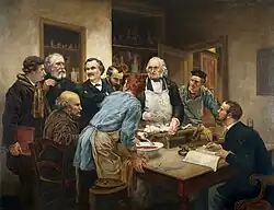 Bernard's scientific discoveries were made through vivisection, of which he was the primary proponent in Europe at the time. In his description of the single-mindedness of scientists trying to prove their theories, he wrote: "[h]e does not hear the animals' cries of pain. He is blind to the blood that flows."[18] His use of vivisection disgusted his wife and daughters, who returned at home once to discover that he had vivisected the family dog.[19] The couple was officially separated in 1869 and his wife went on to actively campaign against the practice of vivisection.[20] Some in the scientific community were also uncomfortable with the practice. The physician-scientist George Hoggan spent four months observing and working in Bernard's laboratory, later writing that his experiences there had "prepared [him] to see not only science, but even mankind, perish rather than have recourse to such means of saving it."[21] Hoggan was a founding member of the National Anti-Vivisection Society in the mid-1870s.[22][23]