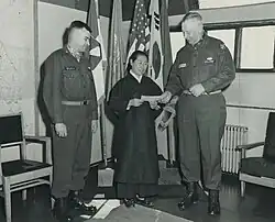 LTG Claude B. Ferenbaugh (right), deputy Eighth Army commander, presents a check for $595 to Mrs. On Soon Whang, director of the Orphans' Home of Korea, Cheju Island. Chief of staff BG Dwight E. Beach observes. The check is the semi-annual interest on the orphanage's perpetual support trust fund. Stars and Stripes, 1 March 1955