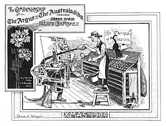 In late 1904 Marquet drew and printed a satirical Christmas card on behalf of the compositors employed by The Argus and The Australasian newspapers. The image on the card showed an anthropomorphised Linotype machine shaking hands with a compositor, at a time when mechanical type-setting was replacing the jobs of large numbers of 'comps' in Melbourne.[47]