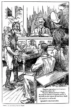 A cartoon by Marquet was published in the 3 November 1904 issue of Melbourne's Punch.[48] The Punch Annual for 1904, published on 6 December, included at least eight of Marquet's cartoons, several of them being large format illustrations including a full-page illustration of 'An A.N.A. Conference' (incorporating the 1905 calendar) and a full-page twelve-frame comic strip 'Across the Continent'.[49] A short story written and illustrated by Marquet, 'How Smith Left Home', was published in Punch in the issue of 29 December 1904.[50]