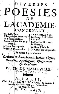 A member of the circles of Valentin Conrart and of Marie de Gournay, a regular at the Hôtel de Rambouillet, Malleville contributed a dozen poems to the Guirlande de Julie. His most famous sonnet,[5] La Belle Matineuse, was composed on the occasion of a poetic joust with Vincent Voiture on a theme that goes back to the Latin poet Catullus and was taken up successively by Clément Marot, Joachim du Bellay, Francis I of France, Annibale Caro and François Tristan l'Hermite.[6] Like other French poets of the time, he wrote sonnets on the themes of La Belle More, La Belle Gueuse and La Belle Baigneuse, borrowed from Giambattista Marino.[7] The name of Malleville has long been known to the general educated public only by this appreciation of Nicolas Boileau: "A sonnet without faults alone is worth a long poem. / But in vain a thousand authors think they can do it; / And that happy phoenix is yet to be found. / Barely in Gombaut, Maynard and Malleville, / Can you admire two or three out of a thousand. »[8]
