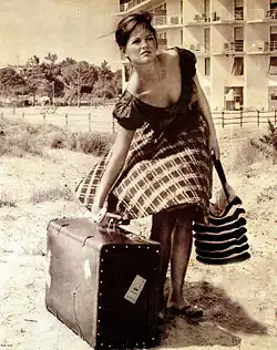 In 1961, Cardinale portrayed a sultry nightclub singer and young mother in Valerio Zurlini's Girl with a Suitcase. As a result of her own experience of early motherhood, Cardinale naturally conveyed the concerns of a teenaged mother, identifying fully with the character of Aida.[48] Such was her psychological involvement that she needed several months to overcome her apprehensions and prepare for the part.[49] Zurlini chose her for such a difficult role against everyone's advice, as she was not yet considered a "real" actress, nor was she (yet) one of the most celebrated Italian beauties.[50] He was very close and supportive of Cardinale during the production, though, and a true friendship developed between the two, based on a deep mutual understanding. Cardinale remarked: "Zurlini was one of those who really love women: he had an almost feminine sensitivity. He could understand me at a glance. He taught me everything, without ever making demands on me. ... He was really very fond of me."[48] Cardinale was warmly praised by the critics for her performance in Girl with a Suitcase, Dennis Schwartz considering her to have been at her "charming best".[51] Later in 1961, Cardinale starred as a prostitute opposite Jean-Paul Belmondo in Bolognini's La Viaccia. Both Girl with a Suitcase and La Viaccia were presented at the 1961 Cannes Film Festival. At the time, Cardinale was not considered comparable to the two divas of Italian cinema, Sophia Loren and Gina Lollobrigida, but several newspapers and magazines, including Paris Match, began to consider her to be a credible young rival to Brigitte Bardot.[52] Cardinale's 1961 appearances also included Henri Verneuil's French comedy Les Lions sont lâchés[53] and Auguste, in which she had a cameo role.[54]