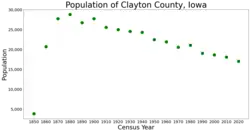 Clayton County is a county located in the U.S. state of Iowa. As of the 2020 census, the population was 17,043.[2] Its county seat is Elkader.[3] The county was established in 1837 and was named in honor of John M. Clayton,[4] United States Senator from Delaware and later Secretary of State under President Zachary Taylor.