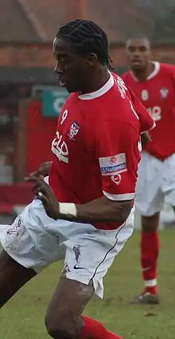 He broke his fibula during August 2009, which resulted in him being ruled out of playing for eight weeks.[82] He finished 2009–10 with 39 appearances and 13 goals.[83] His first appearance of 2010–11 came in the opening match, a 1–0 home defeat to Hereford on 7 August 2010,[84] in which he missed an early opportunity to score, shooting wide of the goal having been one-on-one with goalkeeper Adam Bartlett.[85] His first goals of the season came after scoring twice in a 7–0 home victory over Barnet on 21 August 2010,[84] the first a shot into the bottom left of the goal and the second a close-range header.[86] He finished the season with 48 appearances and 29 goals,[84] including 28 goals in the League Two, making him the division's top scorer.[87]