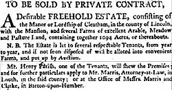 According to Charles Darwin the Cleatham Estate was sold by the Darwin family in 1760. The new owner was Charles Wigelsworth (1716-1783) who was described as "a gentleman". In his Will of 1783 he leaves the house to his eldest son Charles Wigelsworth[6] of Louth who died in 1799. In 1801 it was sold to George and Matthew Maw.