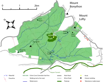 The park's terrain features creeks, steep-sided gullies, eucalypt stringybark forests, and woodlands, which support a variety of habitats. It contains some of the last intact swamps and bogs in the region, providing habitat for endangered and endemic species such as the southern brown bandicoot and king fern. Waterfall Gully and Mount Lofty Summit are located within the park and are linked by a popular walking trail.[6] Most of the park consists of bushland, with woodlands dominating and some open areas where clearing has occurred.[7]