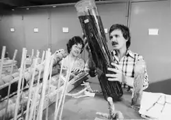 |  Cleofé E. Calderón and Thomas R. Soderstrom examining bamboo samples in 1977. | |