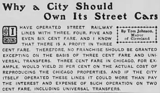Tom L. Johnson was elected mayor of Cleveland in 1901 as a proponent of municipal ownership.[4][5] One of his campaign slogans had pertained to the operation of streetcars, proclaiming to champion, "three cent fares and universal transfers".[5]