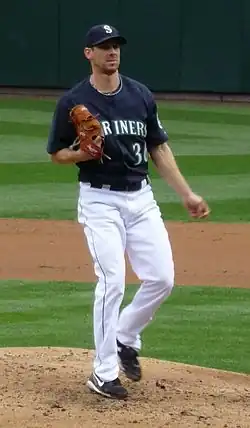 On December 16, 2009, the Phillies traded Lee to the Seattle Mariners in exchange for three prospects: right-handed pitchers Phillippe Aumont and J. C. Ramírez, and outfielder Tyson Gillies.[103] The Mariners had devoted their offseason to acquiring a strong starting pitcher, and had initially pursued Rich Harden, who was acquired as a free agent by the Texas Rangers. Phillies general manager Ruben Amaro Jr. offered to trade Lee to Seattle if he and the Phillies could successfully acquire Halladay from the Blue Jays.[104] Lee was taken by surprise upon hearing of the trade, which had occurred amidst talks of a contract extension with the Phillies, but said he understood why Philadelphia would take "an opportunity to get the best pitcher in baseball" instead. The Halladay—Lee switch was the first time in MLB history that two Cy Young-winning pitchers had been traded on the same day.[105] That February, Lee underwent foot surgery to remove a bone spur that had broken loose. The surgery was considered minor, and Mariners general manager Jack Zduriencik expressed confidence that it would not impede Lee's preparation for the upcoming season.[106]