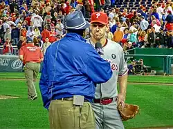 In addition to his command of multiple varieties of pitch, Lee was also known for his consistent and methodical approach on the mound. Rangers reliever Darren O'Day referred to Lee as a "technician", because he would not become emotional or alter his rhythm under high-stress situations, such as when multiple runners were on base.[197] His Phillies teammates and general manager both noted Lee's composure on the mound as one of his strengths, as it allowed him to retain control of the game.[201] Despite this, Lee's stubborn personality sometimes led to a short temper, such as when he appeared to intentionally hit Sammy Sosa with a pitch or would argue with his catcher mid-game.[141]