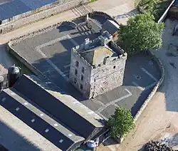 The tower measures 33 ft (10 m) by 26 ft (7.9 m), with red sandstone walls around 3 ft (0.91 m) thick and 37 ft (11 m) high.[21] The ground floor was originally the parlour, with a carved wooden ceiling and a fireplace, with doors leading externally and into the hall.[22] Originally, the stairs did not reach down to the ground floor.[23] The first floor formed the principal chamber in the tower, accessed from stairs in the hall; it had a fireplace, a garderobe and its walls would have been plastered and painted, with wood panelling.[24] Stairs led up to the second floor, again equipped with a fireplace and wood panelling, and up onto the roof.[25]