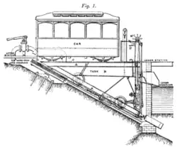 The railway was 450 feet (137 m) long, and rose 200 feet (61 m) at a gradient of about 1 in 2.2 (45%).[4] There were four cars in two connected pairs, essentially forming two parallel funicular railways, one being for exclusively first class passengers; the journey took just 40 seconds.[7] The gauge of the tracks has reported as being between 3 ft (914 mm)[10] and 3 ft 8+1⁄2 in (1,130 mm)[11] with two other sources giving the gauge as (965 mm)[12] and 3 ft 2.5 in.[13]