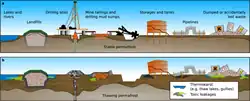 For much of the 20th century, it was believed that permafrost would "indefinitely" preserve anything buried there, and this made deep permafrost areas popular locations for hazardous waste disposal. In places like Canada's Prudhoe Bay oil field, procedures were developed documenting the "appropriate" way to inject waste beneath the permafrost. This means that as of 2023, there are ~4500 industrial facilities in the Arctic permafrost areas which either actively process or store hazardous chemicals. Additionally, there are between 13,000 and 20,000 sites which have been heavily contaminated, 70% of them in Russia, and their pollution is currently trapped in the permafrost.