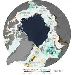 The reduction of sea ice has brought more sunlight to the phytoplankton and increased the annual marine primary production in the Arctic by over 30% between 1998 and 2020.[1]: 2327 As the result, the Arctic Ocean became a stronger carbon sink over this period;[100] yet, it still accounts for only 5% to 14% of the total ocean carbon sink, although it is expected to play a larger role in the future.[101] By 2100, phytoplankton biomass in the Arctic Ocean is generally expected to increase by ~20% relative to 2000 under the low-emission scenario, and by 30-40% under the high-emission scenario.[1]: 2329