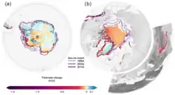 Modelling studies show that strong Arctic amplification only occurs during the months when significant sea ice loss occurs, and that it largely disappears when the simulated ice cover is held fixed.[24] Conversely, the high stability of ice cover in Antarctica, where the thickness of the East Antarctic ice sheet allows it to rise nearly 4 km above the sea level, means that this continent has experienced very little net warming over the past seven decades, most of which was concentrated in West Antarctica.[25][26][27] Ice loss in the Antarctic and its contribution to sea level rise is instead driven overwhelmingly by the warming of the Southern Ocean, which had absorbed 35–43% of the total heat taken up by all oceans between 1970 and 2017.[28]