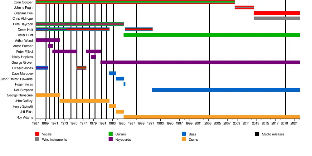 For Rich Man (November 1972; produced by American Richard Gottehrer and their very first to chart in the lower reaches of the US charts) in 1972 the band had settled into a permanent grouping, which remained stable for a decade, until 1982, comprising Colin Cooper (saxes, harmonica, clarinet, rhythm guitar and vocals), Peter Haycock (guitars, bass and vocals), Derek Holt (bass, keyboards and vocals) and John Cuffley (drums, percussion).[7]