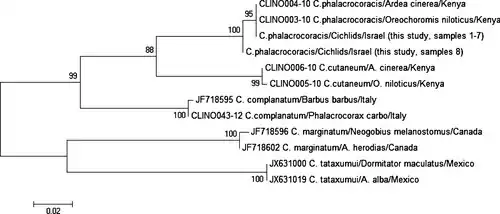 - ^ Caffara, M., Davidovich, N., Falk, R., Smirnov, M., Ofek, T., Cummings, D., Gustinelli, A. & Fioravanti, M. L. 2014: Redescription of Clinostomum phalacrocoracis metacercariae (Digenea: Clinostomidae) in cichlids from Lake Kinneret, Israel. Parasite, 21, 32. doi:10.1051/parasite/2014034 PMID 24986336 PMC 4078730
