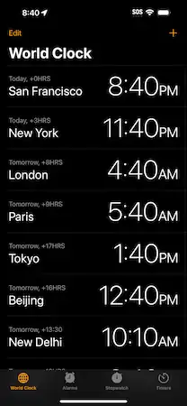The World Clock feature in Clock on an iPhone 15 Pro Max running iOS 17  | |||