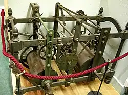 As of 2010, the original 1836 turret clock mechanism by John Moore Junior (later John Moore & Sons) was on display at Herne Bay Museum and Gallery, having been replaced in 1971.[25][26] The mechanism is sometimes erroneously attributed to Peter Morton of Herne Bay and John Greenwood of Canterbury because their names are engraved on the front, however they were the suppliers and could not have manufactured such a large mechanism. This mechanism is listed in John Moore's 1877 catalogue as: "Herne Bay, Kent. Four 5ft dials, the gift of Mrs Thwaites (sic)." It was installed in the tower on a trestle and encased in a deal box, with doors for access to the winding mechanism. It had extra brass wheels for the striking bell, and was held in an iron frame. The clock had to be wound twice a week, the clock weights providing the stored energy. The pendulum was about 12 feet (3.7 m) long, giving a slow beat of nearly two seconds.[26] The clock winder had to ascend 66 steps, then turn the heavy strike winder 75 times, and the time winder 20 times, using a crank.[19] The bell, made of bell metal, was supplied by Thomas Mears II in 1837, weighs 12 cwt and measures 36 inches (91 cm) high and 46 inches (120 cm) diameter. The bell is still functioning in the Tower.[27]