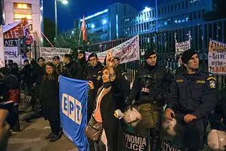 Most of the workers refused to leave the ERT building and continued broadcasting their radio,[22] and television[23] broadcasts as well as through the internet. On 24 October 2013 the EBU stopped transmitting ERT's programme via its satellites, which affected terrestrial broadcasting in some parts of Greece. At dawn on Thursday 7 November 2013, riot police and in the presence of a prosecutor entered the Agia Paraskevi Radiomegaron, evacuated it and arrested four employees.[24] In this way, they put an end to five months of radio and television broadcasting from the Radiomegaron. This was followed by clashes and limited use of tear gas outside the building where people gathered after a call by the workers.[25]