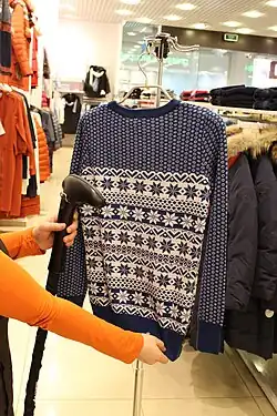 A clothes steamer, also called a garment steamer or simply a steamer, is a device used for quickly removing wrinkles from garments and fabrics with the use of high temperature steam.[1] They can for example be used to straighten wrinkles on shirts by releasing tension in the fabric so that it straightens itself. Steamers can also remove smells.