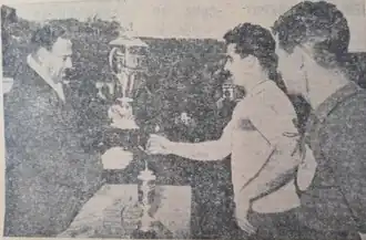 As a Divizia B team, Progresul Oradea reached the 1955 Cupa României final, which was lost with 3–6 în front of CCA București.[4][5] The following year as a Divizia A team, the club won the 1956 Cupa României final, after a 2–0 win against Divizia B team Energia Câmpia Turzii.[6] The winning squad of Progresul was managed by Camil Scherz and formed of the following players: Adalbert Gébner – Gheorghe Kromely, Andor Tyirják, Gheorghe Barcu, Iosif Bartha, Ștefan Cuc, Ludovic Tóth, Ladislau Köszegi, Alexandru Karikas, Ladislau Vlad and Iosif Mészáros.[3]
