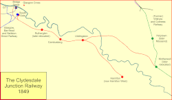 The Clydesdale Junction Railway was promoted to connect Hamilton and Motherwell with the southern side of Glasgow, by joining the eastern end of the Polloc and Govan Railway, and forming a short line from it to a Glasgow terminal.