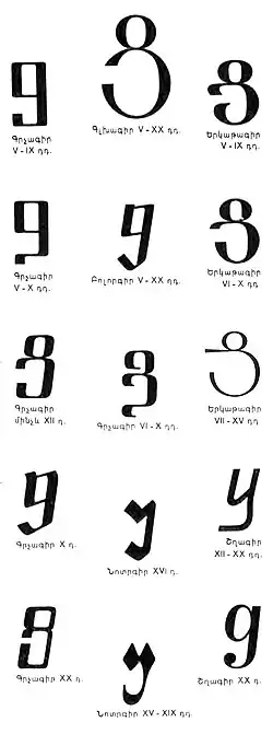 Tsʼo, or Cʼo (majuscule: Ց; minuscule: ց; Armenian: ցո; Classical Armenian: ցօ) is the thirty-third letter of the Armenian alphabet. It represents the voiceless aspirated alveolar affricate (/t͡sʰ/) in both Eastern and Western varieties of Armenian. Created by Mesrop Mashtots in the 5th century, it has a numerical value of 6000.[1] Its shape in capital is visually similar to one other Armenian letter, Hi (Յ) or the number 8. Its shape in lowercase is also similar to the minuscule form of the Latin letter G (g). In cursive, both letters are similar to a cursive Y.