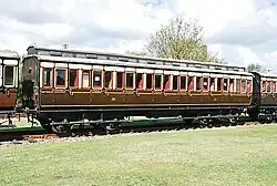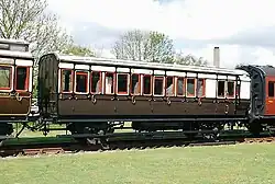 The livery of early carriages was a dark chocolate brown but from 1864 the upper panels were painted white which became a pale cream after being varnished and exposed to the weather. These panels were later painted in cream to give a similar effect. From 1908 carriages were painted chocolate brown all over but this changed to a red lake colour in 1912. A two-colour livery reappeared in 1922, now with a richer shade of cream on the upper panels and chocolate brown below. Certain vehicles such as parcels vans and horse boxes, which were allowed to run in passenger trains, were often painted in just chocolate brown when the passenger carrying coaches were in chocolate and cream, and so this non-passenger carrying coaching stock came to be known as "brown vehicles".[3]