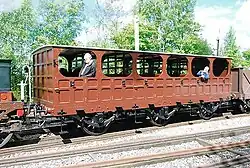 Early GWR carriages, in common with other railways at the time, were typically wooden vehicles based on stagecoach practice and built on short, rigid six-wheel (or sometimes four-wheel) underframes, although the 7 ft (2,134 mm) broad gauge allowed wider bodies with more people seated in each compartment. Three classes were provided, although third class carriages were not conveyed in every train and, for the first few years, were little more than open trucks with rudimentary seats. Some rigid eight-wheeled carriages were produced but vacuum brakes and bogies made an appearance before the end of the broad gauge in 1892.[1]
