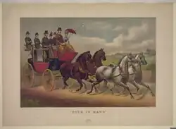 One of the original Coaching Club coaches was named Tally-Ho. Built in 1875 by Holland & Holland coachbuilders in London, it was purchased by Colonel Kane and brought to New York in 1876. It became so well known that any coach-and-four was called a tally-ho by the general public.[1] Kane's Tally-ho was donated to the Museum of the City of New York in 1933, and is now in the carriage collection at the Long Island Museum of American Art, History, and Carriages in Stony Brook, New York.[1][7]