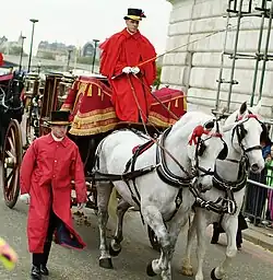The role of the coachman, who sat on the vehicle, was contrasted with that of the postillion mounted directly on one of the drawing horses. On the grandest ceremonial occasions the coachman might escort a number of his postillions with his own horse.