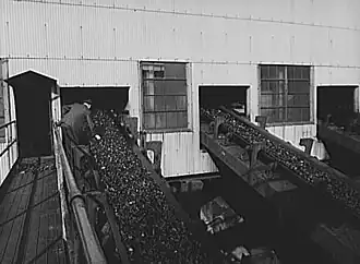 Ideally, coal breakers were placed so that the top of the breaking plant was equal to or slightly below the mine mouth so that gravity would move the coal to the breaking plant.[3][4] Where this was not possible, coal would be hoisted to the top of the coal breaking plant.[3][4] A boiler and boilerhouse would be located nearby to provide power for the hoist, moving screens, jigs, and crushers (although in more modern times this is supplied by electricity),[8] along with an engine house (to house the engine for the hoist), pumps and pumphouse (to supply the coal washing machines with water), and headframe (for the hoist).[3][4] The typical coal breaking plant was often eight or nine stories tall,[2] sometimes rising 150 feet high or more.[3][4]