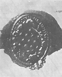 In 1894, Palemon Howard Dorsett (a lifelong Department of Agriculture employee) turned up with a metal die very similar to the original die of the Great Seal, except that the arrows and the olive branch were switched, indicating an intentional "difference" to distinguish it from the actual Great Seal. The die had apparently been owned by George Washington, though there are no known uses of this die, and there even is no indication it could actually be used as a seal. The origins and purpose of this die remain unknown, though the authors of a 1978 book on the Great Seal speculated it was a gift to Washington and possibly an early version (or forerunner) of a presidential seal.[12] The Dorsett seal was subsequently loaned to the Mount Vernon Ladies' Association to be displayed at Washington's estate.[13]