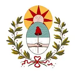 The coat of arms of the Argentine Republic or Argentine shield[1] (Spanish: Escudo de la República Argentina) was established in its current form in 1944 but has its origins in the seal of the General Constituent Assembly of 1813.[2] It is supposed that it was chosen quickly because of the existence of a decree signed on February 22 sealed with the symbol.[3] The first mention of it in a public document dates to March 12 of that same year, in which it is stated that the seal had to be used by the executive power, that is, the second triumvirate. On April 13 the National Assembly coined the new silver and gold coins, each with the seal of the assembly on the reverse, and on April 27 the coat of arms became a national emblem. Although the coat of arms is not currently shown on flags, the Buenos Aires-born military leader Manuel Belgrano ordered to paint it over the flag he gave to the city of San Salvador de Jujuy, and during the Argentine War of Independence most flags had the coat of arms.