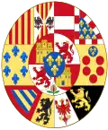 1540—1556 | Prior to its independence, as part of the Spanish Empire, in the Captaincy General of Chile the coats of arms of Spain were used. Although initially their use was only nominal, by 1750 the coat of arms of the Spanish monarch appeared on every coin coined in Chile. In the golden coins (Escudos), from 1749 to 1763, the greater arms of Phillip V were shown; and from 1763 to 1817, when Chile became independent, Charles III and Ferdinand VII used another version that included Parma and Tuscany.[4] The Spanish emblem was no longer used during the final years of the Patria Vieja.[1] |