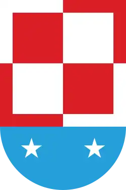 The first design of the coat of arms of Dęblin was introduced in 1974, in the commemoration of the 20th anniversary of the settlement receiving the town privileges in 1954. It consisted of an Iberian-style escutcheon (shield). The top portion of the shield, which had the height of 2/3 of the coat of arms, consisted a square field depicting a Air Force checkerboard, the military aircraft insignia of the Polish Air Force. It consisted of four equal squares, of which the upper left and lower right were red, and the other two, white. These were surrounded by a border of inverted (counterchanged) colors with 1/5 of the thickness of a single square. The bottom portion of the coat of arms, which had the height of 1/3 of the coat of arms, consisted of a blue field in the shape of a half of a circle, featuring two white (silver) horizontally-placed five-pointed stars.[3]