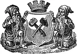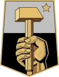 For some time after the adoption of the official coat of arms, a version with a rose instead of a hammer was used.[1]