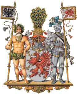 Above the shield was placed a grey (silver) barred helmet with a grey (silver) mantling, and a drapery tied to it. On top of the helmet were a yellow (golden) crown and a ducal hat with a plume of peacock feathers on top. On the sides of the shield was the supporters holding it. To the left, was a wild man, figure depicting an almost-naked male human with a beard wearing oak leaves around his hips, and holding a spear in his right hand. At the top of the spear was attached banner of arms of Prussia, which depicted a black eagle with a yellow (golden) crown on its head, and a yellow (golden) upwards-curved bar, stretched from its chest to the end of its wings, ended in a trefoil, on each of its wings. The creature was placed on a white background. To the right of the shield, was placed a knight in grey (silver) armour, holding a spear in their left hand. At the top of the spear was attached a banner of arms, depicting a red griffin with a yellow (golden) beak and claws, placed on a white background. Both supporters stood on a wooden shelf.[1][23]