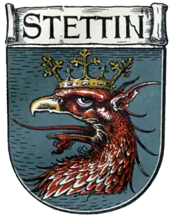 The coat of arms that serves as the symbol of the city of Szczecin in West Pomeranian Voivodeship, Poland depicts the head of a red griffin with a yellow (golden) beak wearing a yellow (golden) crown, placed on the blue background.[1]